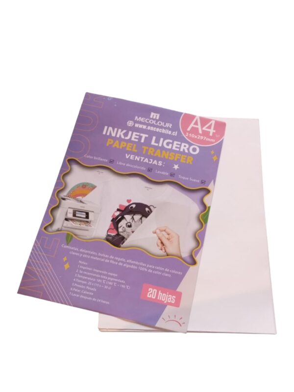 La característica principal de este papel de transferencia es su capacidad para transferir imágenes de manera efectiva y vibrante a telas de colores claros. Es importante seguir las instrucciones del fabricante para obtener los mejores resultados durante el proceso de transferencia, que generalmente implica imprimir la imagen en el papel y luego transferirla a la tela mediante calor y presión.